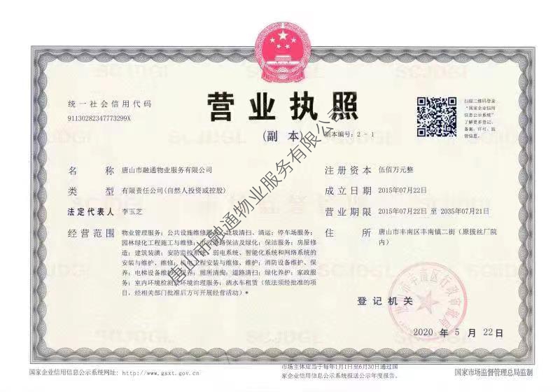 唐山市融通物業(yè)服務有限公司成立于2015年,注冊資本500萬元。公司設在唐山市豐南區(qū)豐南鎮(zhèn)二街(原拔絲廠院內(nèi)),總經(jīng)理李玉芝。